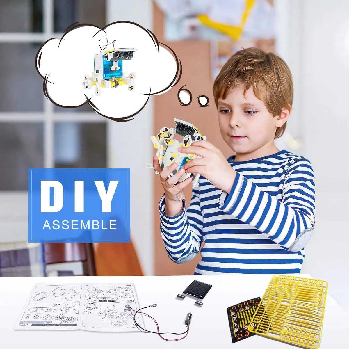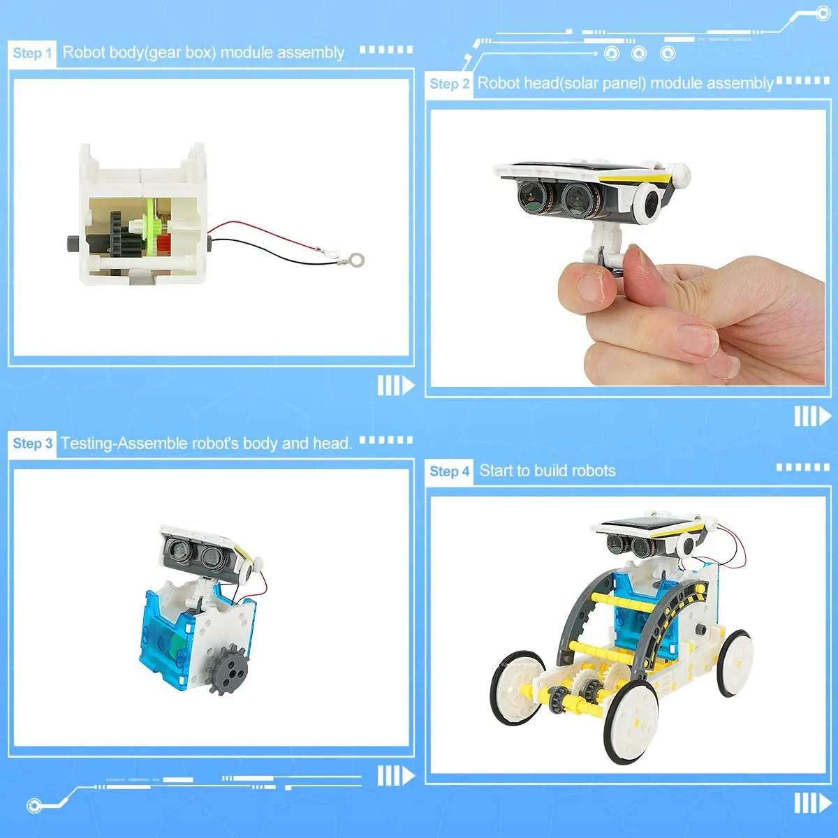 There are two levels in building the robot kit, level one include: Turtle-bot, Beetle-bot, Quadru-bot, Boat-bot, Walker-bot, Dog-bot and wheel-bot